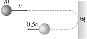 3. 그림은 질량이 m인 야구공이 v의 속력으로 벽에 수직으로 충돌한 후, 0.5v의 속력으로 정반대 방향으로 튀어나오는 것을 모식적으로 나타낸 것이다.