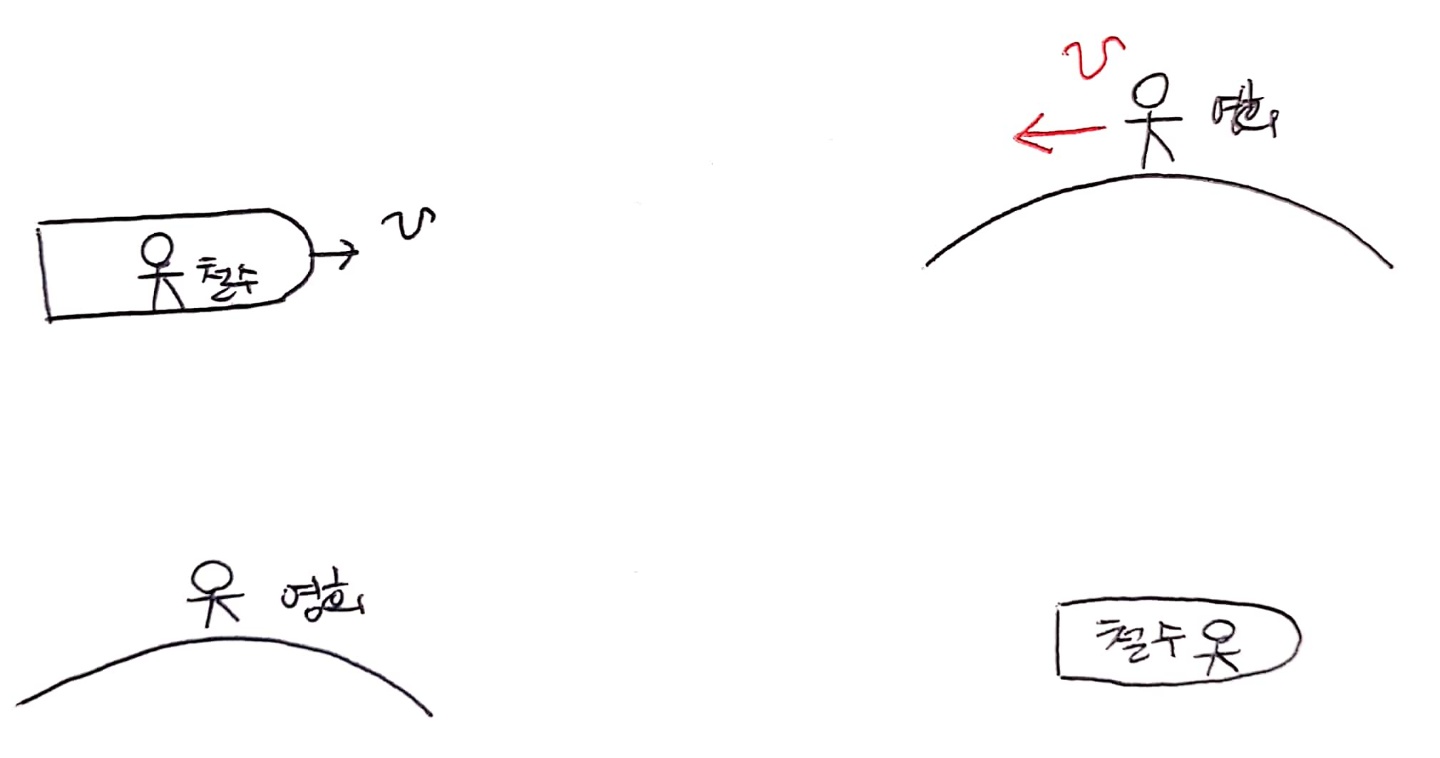 영희 입장에서는 철수가 움직이고 있으니 철수의 시간이 느리게 흐릅니다. 하지만 철수 입장에서는 영희가 움직이죠.(=상대성 원리) 따라서 철수 입장에서는 영희의 시간이 자기의 시간보다 느리게 흐릅니다. 포인트는 '누가 보냐에 따라 움직이는 물체의 운동 상태가 결정되고, 관찰자가 보기에 움직인다고 판단되는 물체의 시간이 느리게 흐르는 걸로 측정된다.'입니다.