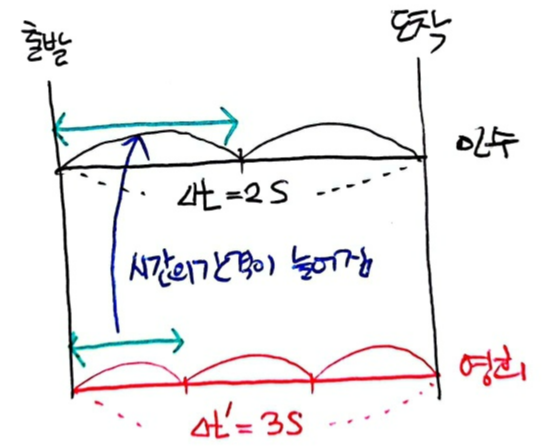 영희가 측정한 빛의 왕복 시간을 3초라고 가정한다면, 민수가 측정한 빛의 왕복 시간은 3초보다 작은, 2초라고 가정할게요. 왜 이런 일이 일어난 걸까요? 민수처럼 움직이는 세상에서는 '시간의 간격'이 팽창했기 때문입니다. '시간의 간격'이 팽창했다는 건 시간의 흐름이 느려진 거와 같아요. 영희 세상에선 '똑딱'거렸을 시간 간격이 민수 세상에선 '또옥따악'으로 늘어진 거죠. 시간이 느리게 흐르다 보니 3초 걸릴 시간이 2초가 된 겁니다. 즉 영희에 대해 움직이고 있는 민수의 시간은 느리게 흐릅니다. 이처럼 정지한 관찰자(=영희)가 보는 움직이는 물체(=민수)에서의 시간은 느리게 흐르고, 이를 '시간 지연' 혹은 '시간 팽창'이라고 해요. 만약 움직이는 세상의 속도가 더 빨라진다면 그 세상에서의 시간은 더욱 느리게 흐릅니다.