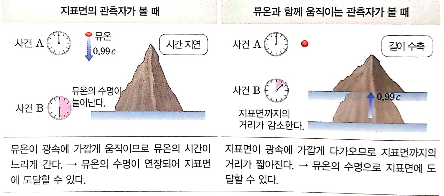 따라서 어떤 관측자가 보아도 뮤온이 지표면에 도달해야 한다는 결론에는 차이가 없어요.