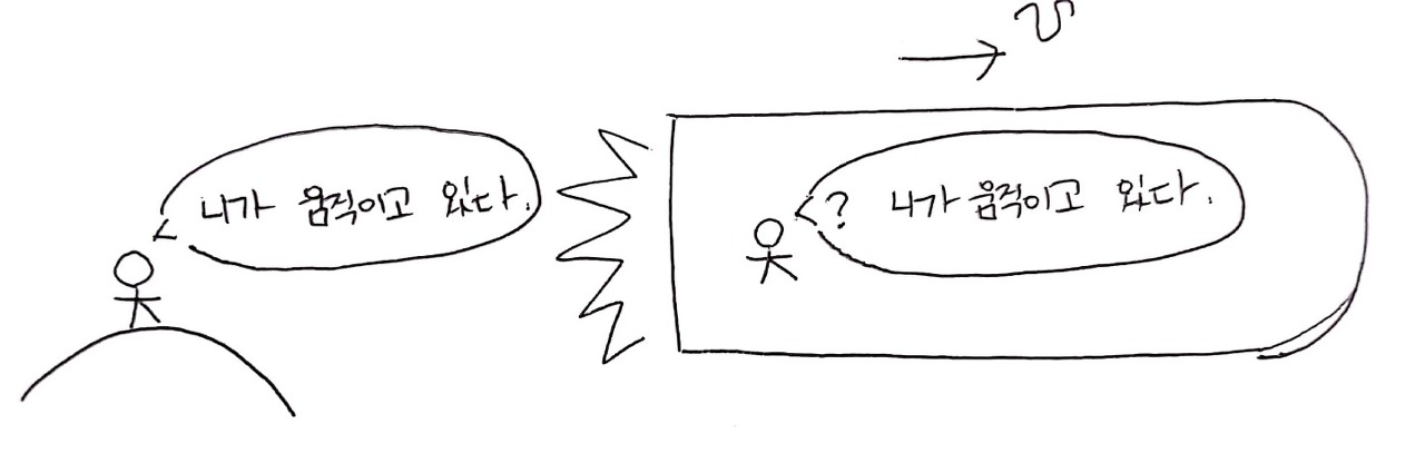 A 입장에는 B가 움직이므로 B의 시간이 더 느리게 흐릅니다. 따라서 A 입장에는 B가 젊어 보여야 해요. 하지만 B 입장에는 A가 움직이므로 A의 시간이 더 느리게 흐릅니다. 따라서 B입장에는 A가 젊어 보여야 해요. 서로가 어려 보인다고 칭찬의 미덕을 뽐내는 훈훈한 장면이지만 슬프게도 한 명만 맞는 말을 하고 있습니다. 누가 맞는 말일까요? 바로 A입니다.