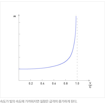 가속에 쓰인 에너지는 질량으로 바뀝니다. 물체의 질량이 증가하게 되면, 물체의 가속은 어려워질 수밖에 없죠. 따라서 물체의 속도에 한계가 걸려버리게 돼요. 그 한계값이 광속입니다. 세상에서 가장 light한 것이 light인데 빛보다 무거운 게 빛보다 빠를 리 없겠죠?