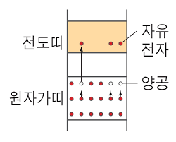 이때 전자가 원자가 띠에서 전도 띠로 전이하면 원자가 띠에는 전자의 빈자리가 생기게 되는데 이를 양공이라 합니다.