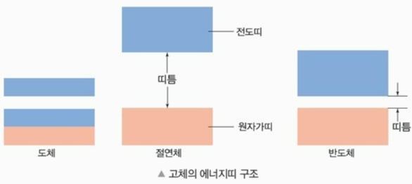 반도체는 원자가 띠와 전도 띠 틈이 부도체의 경우보다는 좁기 때문에 상온에서 전자가 전도 띠로 전이될 여지가 있습니다.