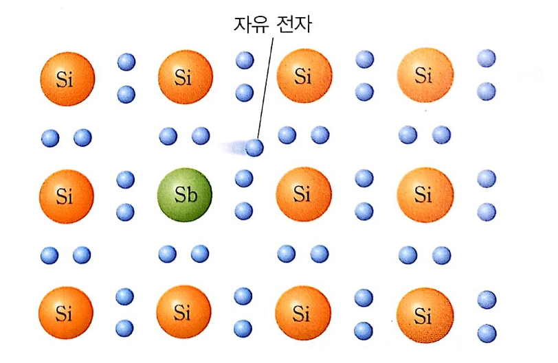 Si, 규소 결정에 원자가 전자가 5개인 안티모니 Sb를 주입하면, Sb의 전자 4개는 각각 이웃한 Si 원자가 전자와 공유 결합을 하고, 남은 1개의 잉여 전자는 결합할 짝이 없어서 자유롭게 돌아다닐 수 있는 자유 전자가 됩니다. 여러 개의 Sb 원자를 첨가하면 자유 전자의 수는 그만큼 많아지는 거고 그에 따라 전기 전도성이 좋아지겠죠?