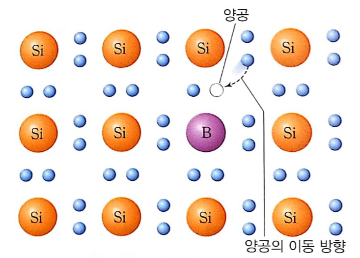 Si, 규소 결정에 원자가 전자가 3개인 붕소 B를 주입하면, B의 전자 3개는 각각 이웃한 Si의 원자가 전자 3개와 공유 결합을 합니다. 그러나 나머지 Si의 원자가 전자 1개는 공유 결합할 전자가 없기 때문에 양공이 생기죠. 양공을 주변의 전자가 채워가는 과정은 곧 양전하의 이동과 같고, B를 많이 주입할수록 양공의 수가 많아지기에 전기 전도성이 좋아집니다.