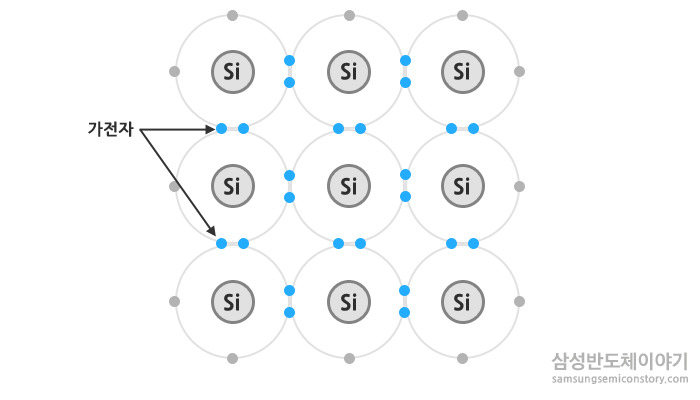 각각의 규소 원자의 원자가 전자는 인접한 규소 원자의 원자가 전자들과 공유 결합을 하여 결정을 이루게 되는데, 이 결정이 바로 순수한 반도체입니다. 순수한 반도체의 전기 전도도는 거의 부도체에 가까워요. 다시 말해 순수한 반도체는 전자 제품으로써 상품적 가치가 떨어집니다. 어떻게 하면 반도체의 전기 전도성을 좋게 할 수 있을까요? "전기 전도성을 올린다"는 것은 "전하의 유동성을 늘린다"는 걸 의미해요. 따라서 순수한 반도체에 다른 물질을 주입하면 전하의 유동성이 늘어납니다.