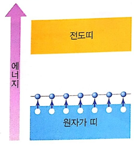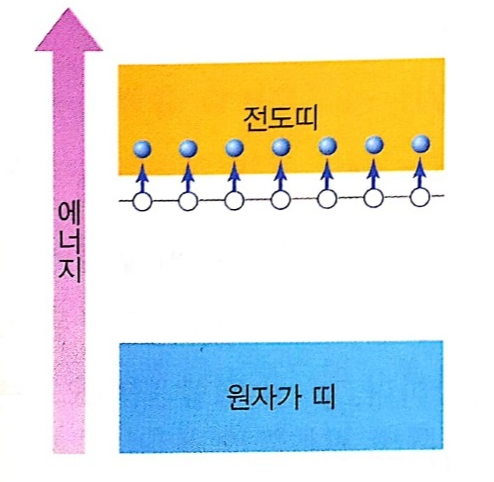 그림과 같은 에너지 띠 구조를 갖는 고체를 도체라 합니다. 이 경우는 모두 상온의 열에너지로도 충분히 전자가 전이할 수 있으므로, 도체는 상온에서 전기가 잘 통합니다.