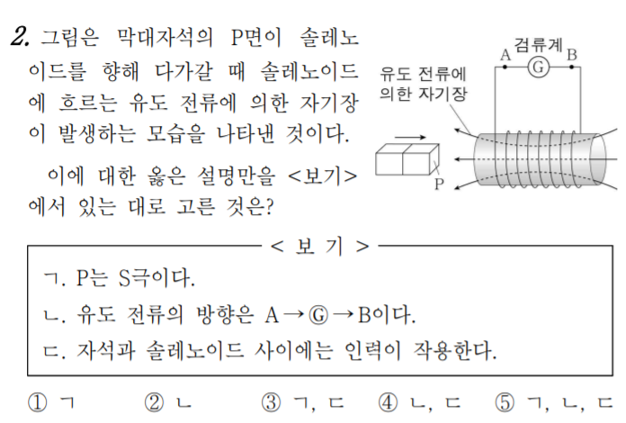 1. N극이 가까이 접근 → 이를 거부(척력) → 유도 전류가 코일 윗방향으로 나가는 자기장(N극) 유도