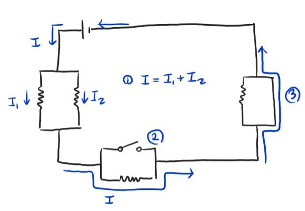 ① 분기점에서 나뉘게 된 전류 I1과 I2의 합은 전체 전류 I와 같습니다.