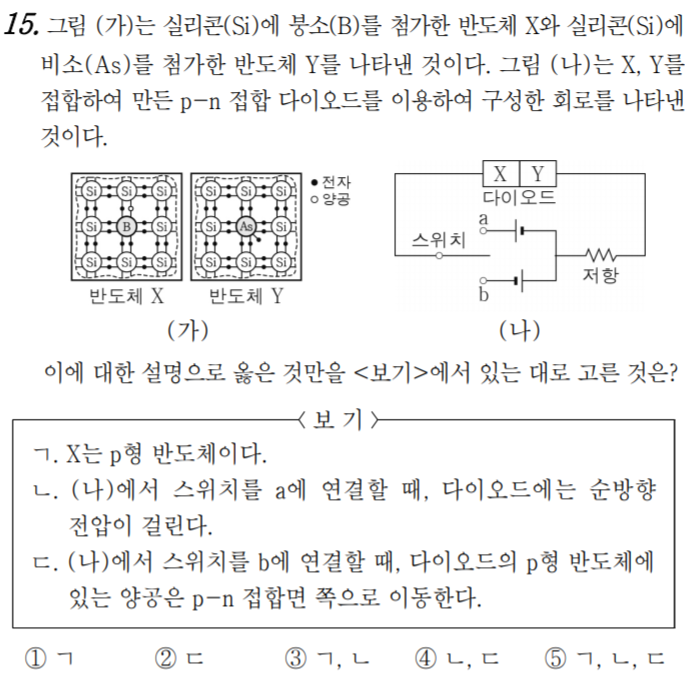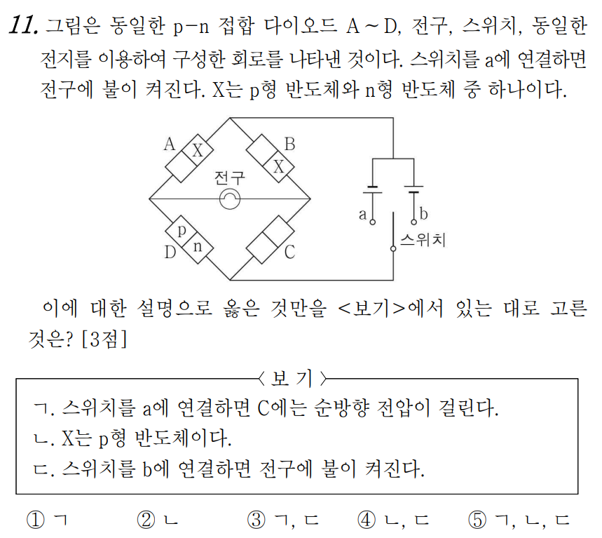 스위치를 a에 연결하면 D에 역방향 전압이 걸리므로 전류는 C로 흘러야 합니다. 즉 C에 순방향 전압이 걸립니다. A와 B는 위치상 둘 중 하나에 역방향 전압이 걸려야 할텐데, A에 역방향 전압이 걸린다면, B에 순방향 전압이 걸린다는 것이고, 그렇다면 B는 저항이 없는 전선이 되어버리기에 전류는 저항이 없는 B로 다 흘러버립니다. 그래서 전구에 불이 들어오지 않죠. 이는 문제 조건에 부합하지 않기에 전류는 전구를 지나 A로 흘러야만 합니다. 따라서 A에 순방향 전압이 걸리고 B에 역방향 전압이 걸려요. A에 순방향 전압이 걸린다는 것은 X가 n형 반도체라는 걸 의미합니다.