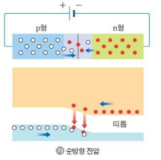 p형 반도체를 전지의 (+)극 쪽에 연결하면, 양전하처럼 행동하는 "p형의 양공은 건전지의 (+)극에 의한 척력"에 의해 오른쪽으로 더 밀려가요. n형 반도체를 전지의 (-)극 쪽에 연결하면, "n형의 전자는 건전지의 (-)극에 의한 척력"에 의해 왼쪽으로 더 밀려가요. 따라서 공핍 영역의 두께가 얇아지는 효과가 나타나므로 전하들이 장벽을 넘어갈 수 있는 확률이 높아지면서 전류가 흐를 수 있게 됩니다.