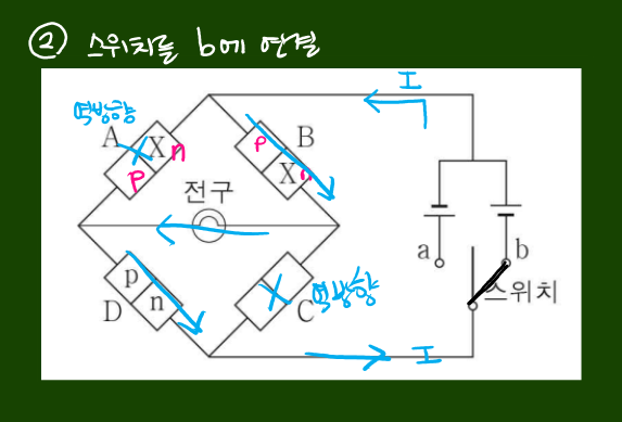 스위치를 b에 연결하면 A에 역방향 전압이 걸리므로 전류는 B로 흐릅니다. 회로의 전압 방향이 바뀌었기 때문에 이젠 C에 역방향 전압이 걸리게 되고 D에 순방향 전압이 걸리게 돼서 전류는 D로 흘러가야 닫힌 회로를 순환할 수 있게 됩니다. 따라서 전류는 전구를 지나야만 해요. 따라서 이 문제의 답은 3번입니다.