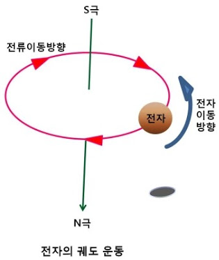 전자가 원자핵 주위를 공전하게 되면 원자핵 주위에 원형의 전류 고리가 생기게 됩니다. 따라서 그에 따른 자기장이 발생해요. 이때 전류가 흐르는 방향은 전자의 이동 방향과 반대입니다.