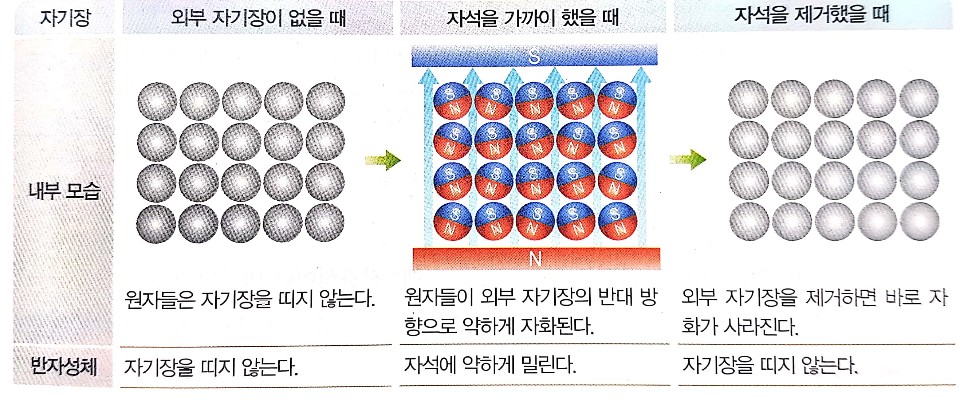 원자는 작은 자석과도 같습니다. 상자성체의 경우에는 외부 자기장이 없을 때, 원자 자석들이 무질서하게 배열돼있다 보니 알짜 자기장이 0이 되어버려 자성을 띠지 않습니다. 그러나 자석을 가까이 했을 때, 원자 자석들이 자석의 자기장 방향으로 약하게 정렬돼요. 이를 자기화 또는 자화라 합니다. 자석의 자기장 방향으로 자화된 상자성체는 자석에 약하게 끌려옵니다. 반면 자석을 제거하면 상자성체의 원자 자석들은 다시 무질서하게 배열되기 때문에 자성을 잃어버립니다. 종이, 백금, 알루미늄, 마그네슘이 대표적인 상자성체입니다.