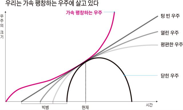 이후에 몇몇 천문학자와 물리학자는 우주가 실제로 수축하지 않고 정적이지도 않으며, 오히려 계속 팽창하고 있다는 증거를 속속들이 발견하게 됩니다. 그 발견 중의 하나가 허블의 적색 편이예요. 이처럼 중력을 거슬러 우주를 가속 팽창시키는 척력의 기원을 아인슈타인은 가상의 에너지, 암흑 에너지로 가정합니다. 현재의 우주 팽창이 설명되기 위해서는 우주 물질의 과반이 암흑 에너지로 구성되어야 한다고 합니다.