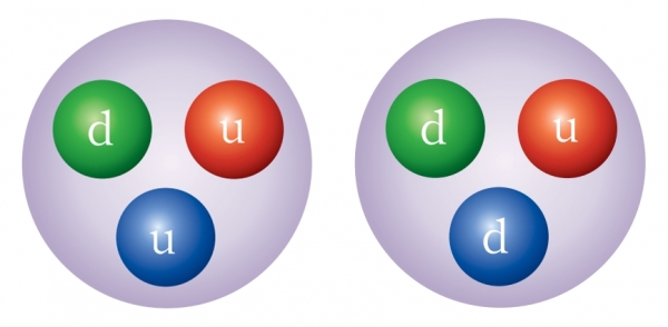 강입자의 구성 요소인 쿼크는 6가지 종류가 존재하는데 이들은 up/down , strange/charm , bottom/up의 세 쌍으로 분류하고, 이들의 첫 글자만을 따서 u, d, s, c, b, t로 표현하여 사용합니다. 양자 색역학에 따르면 쿼크들은 색전하 Red, Green, Blue 중 하나의 특성을 가지게 되는데, 이때 쿼크들은 전체가 무색이 되는 조합으로 결합해야만 존재 의미를 갖기 때문에 쿼크는 홀로 존재할 수 없어요.