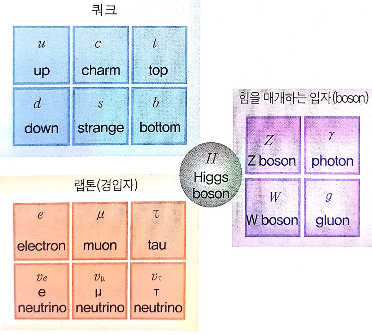 표준 모형은 물질을 구성하는 입자와 이들 사이의 상호 작용을 다루는 현대 입자 물리학의 이론입니다. 표준 모형에 따르면 모든 물질은 세 쌍의 쿼크들과 6개의 경입자와 이들의 반입자들로 구성되어 있어요. 그리고 이들 사이의 힘을 매개하는 입자로 광자, 글루온, W±, Zº, 중력자 등이 있습니다. 두 입자 간의 힘은 그들 사이에 다른 입자를 교환함으로써 전달되는 것이라고 생각할 수 있어요. 마지막으로 입자에 질량을 부여하는 역할을 하는 신의 입자, 힉스 입자가 있습니다.