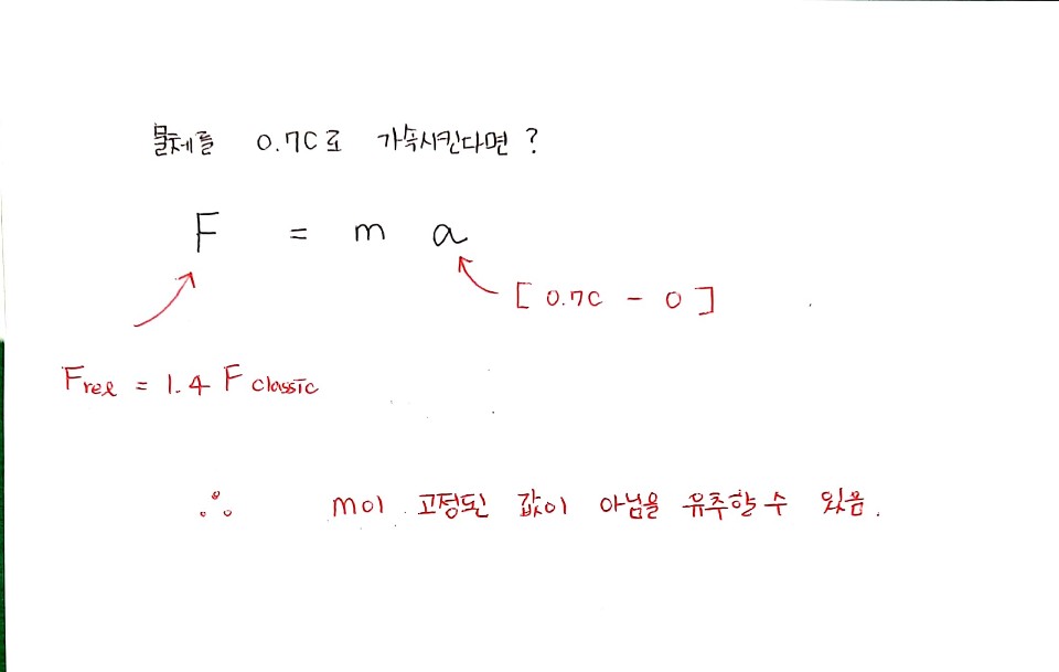 물체를 0.7c로 가속시키기 위해서는 고전역학적 힘 크기보다 1.4배 더 큰 힘이 필요하고