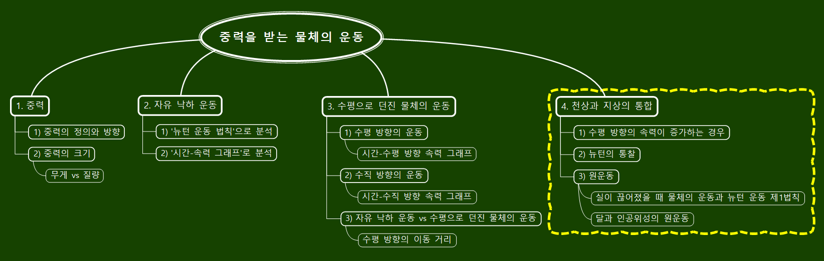 이처럼 자유 낙하 운동, 수평 방향으로 던진 물체의 포물선 운동, 지구 주위의 공전 운동은 모두 중력에 의한 지구 중심 방향의 가속도 운동으로 정리할 수 있습니다.
