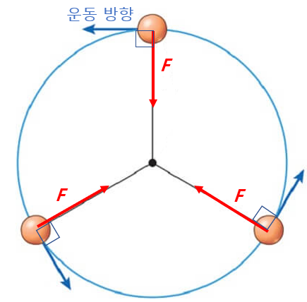 원운동은 물체가 원을 그리며 도는 운동으로써 물체의 운동 방향(=원의 접선 방향), 즉 운동 상태가 계속해서 바뀌기 때문에 가속도 운동의 한 종류입니다. 물체에 작용하는 힘 F의 방향은 원의 중심을 향하며 항상 물체의 운동 방향에 수직입니다.