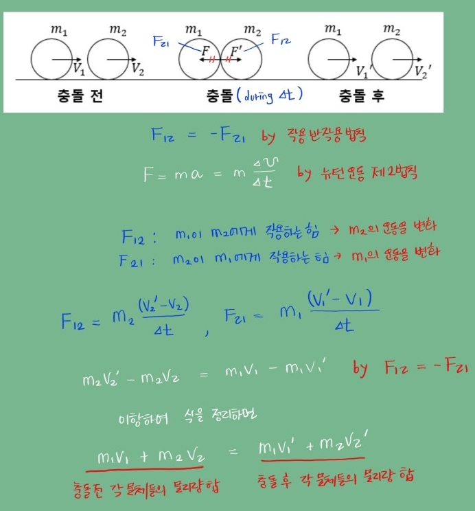 이처럼 물체들의 충돌, 그 이전과 이후를 꿰뚫어 언제나 똑같이 유지되는 특별한 물리량의 합이 있습니다. 이 물리량을 운동량(momentum)이라고 합니다.
