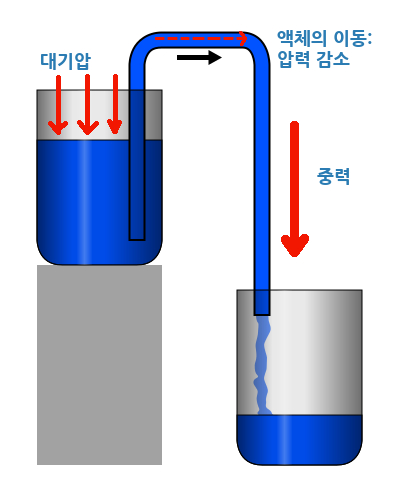 그림과 같이 사이펀의 원리란 대기압과 중력을 이용하여 높은 곳의 액체를 낮은 곳으로 이동시키는 작용, 현상을 의미한다.