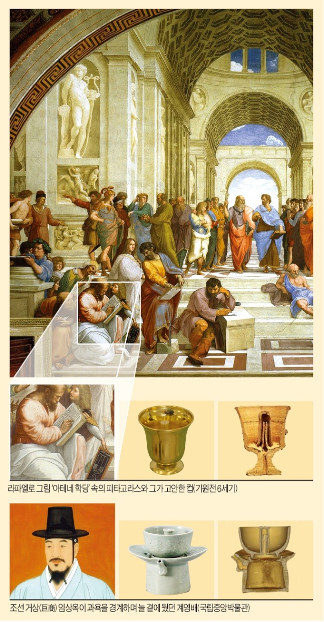 서양에도 계영배와 비슷한 원리로 작동하는 ‘피타고라스의 컵’이 있다. 기원전 6세기에 그리스 철학자 피타고라스가 만들었다. 물이 부족한 그의 고향 사모스 섬에서 물과 와인을 아끼기 위해 발명했다고 한다. 이 컵에 일정 수위 이상 물을 부으면 밑으로 다 새어버린다.