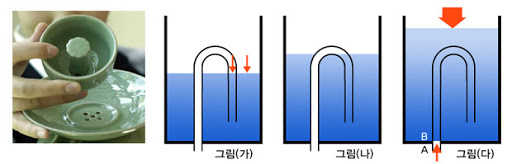 따라서 이 압력차에 의해 물이 위로 끌어올려지고 ∩자관 오른쪽에 도달하면 중력에 의해 떨어지는 것이다.