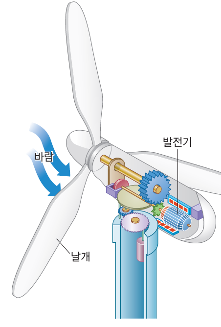 풍력 발전기는 바람이 지속적으로 부는 산이나 바다 근처에 설치합니다. 현재 우리나라는 제주도와 서남해안에 해양 풍력 발전 단지를 건설하고 있어요.