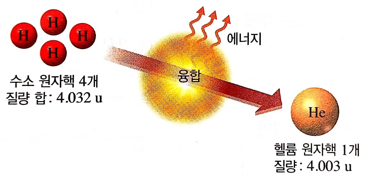 온도와 압력이 매우 높은 태양 중심부에서는 수소 원자핵 4개가 결합하여 헬륨 원자핵 1개로 융합되는 반응이 일어납니다. 이때 질량이 약간 감소함을 확인할 수 있어요. '질량 보존 법칙'에 따르면 반응 전후 총질량은 보존되어야 하지만 이 반응에서의 총질량은 명백히 감소합니다. 질량을 물질적인 것으로만 여긴다면 설명되지 않는 현상이지만, 질량이 에너지로 바뀔 수 있다면 설명되는 현상이죠.