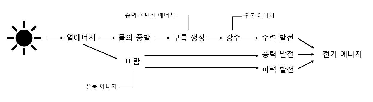 태양의 열에너지에 의해 물과 대기가 순환되는 과정에서 다양한 에너지 흐름이 일어납니다.