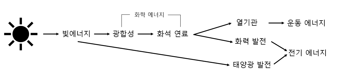 태양의 빛에너지에 의해 탄소가 순환되는 과정에서 다양한 에너지 흐름이 일어납니다.