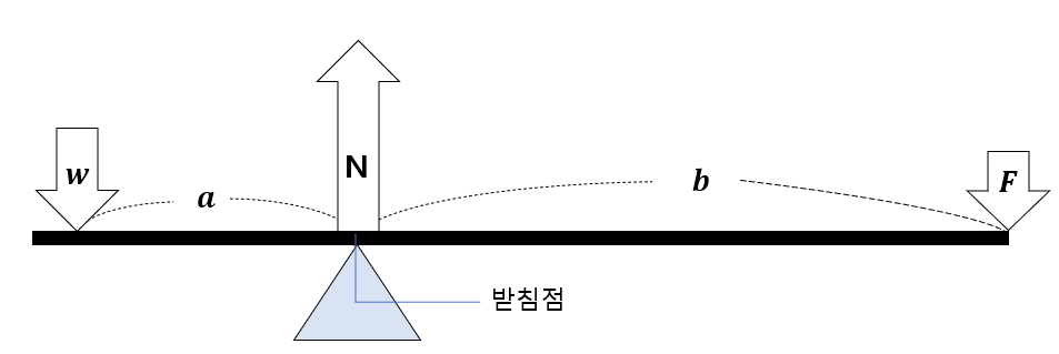 두 번째 조건인 돌림힘의 평형에 따라 물체의 무게 W와 받침점으로부터의 거리 a의 곱이 힘 F과 받침점으로부터의 거리 b의 곱과 같아야 합니다. 그림에서 지렛대의 중심인 받침점이 회전축 역할을 합니다.
