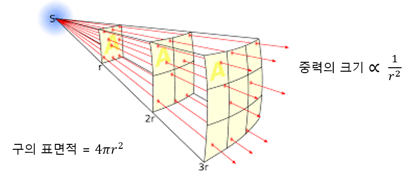 구의 표면적은 반지름이 커질수록 그 제곱에 비례해 함께 커집니다. 만약 태양에서 발생하는 것들이 모든 방향으로 퍼져나간다고 생각해보면, 거리가 멀어질수록 그 영향은 더 넓은 면적에 나누어 퍼지게 되겠죠. 실제로 빛이 이런 방식으로 약해지기 때문에, 불리오는 중력도 같은 원리를 따를 것이라고 예상했던 것입니다.