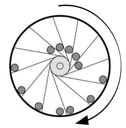 원판이 회전하는 동안 그림과 같은 쇠구슬의 분포로 인해 원판의 무게 중심이 회전축에서 한쪽으로 치우쳐 있어 계속 회전할 것처럼 보입니다. 그러나 실제로는 이러한 장치도 지속적으로 회전할 수 없어요. 회전축을 기준으로 오른쪽과 왼쪽에 있는 쇠구슬들에 작용하는 중력이 만드는 돌림힘을 모두 고려하면, 시계 방향과 반시계 방향 돌림힘의 합은 서로 같아져 전체 돌림힘은 0이 되기 때문입니다. 따라서 중력만으로는 원판에 지속적인 회전을 일으킬 수 없으며, 이 장치는 영구 기관이 될 수 없어요.