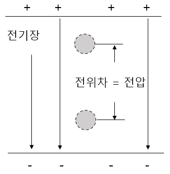 그림과 같이 두 지점 사이의 전위의 차이를 전위차 혹은 전압이라고 합니다.