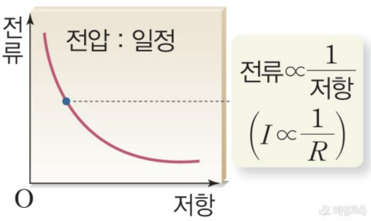 전류를 흐르게 하는 원인인 전압이 커지거나, 전류를 방해하는 정도인 저항이 작아진다면, 회로에 흐르는 전류의 세기는 증가할 거예요. 이처럼 전류는 전압에 비례하고, 저항에 반비례하는 관계를 옴의 법칙이라 합니다.
