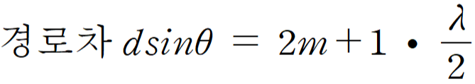 첫 번째 어두운 무늬의 차수 m은 0입니다. 따라서 두 빛의 경로차 dsinθ는 0.5λ예요.
