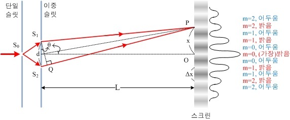 S1과 S2에서 출발한 두 빛이 스크린의 O까지 이동하는 거리가 같기 때문에 두 빛의 경로차는 0이 됩니다. 이는 차수 m이 0일 때의 보강 간섭 조건을 만족시키는 상황이기에, 스크린의 중앙에서는 밝은 무늬가 생깁니다.