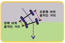 바퀴가 서로 다른 지면의 경계를 비스듬하게 굴러오고 있다. 회색 부분은 매끄럽고 초록색 부분은 거칠다. 왼쪽 바퀴가 초록색 부분에 진입하는 순간부터 왼쪽 바퀴는 상대적으로 느려지고, 오른쪽 바퀴는 상대적으로 빨라 바퀴 간 속력 차이가 발생한다. 같은 시간 동안 속력이 빠른 바퀴가 더 많이 이동하고, 속력이 느린 바퀴는 덜 이동하게 되는데, 결국 이 속력 차이에 의해 진행 방향이 꺾이게 된다. 이처럼 서로 다른 두 물질의 경계면을 비스듬히 지날 때 발생하는 속력 차이가 굴절의 원인이라는 것을 꼭 기억하자.