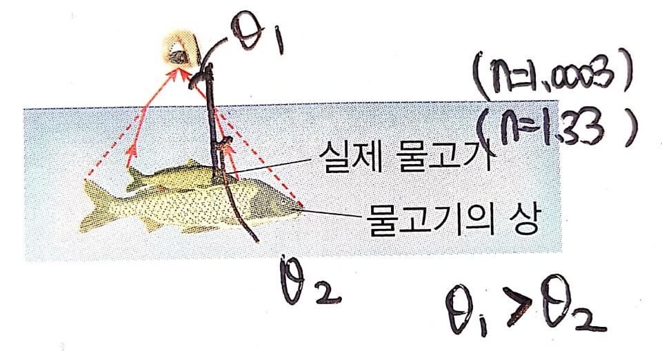 우리가 물체를 인식할 수 있는 이유는 물체에서 반사된 빛이 우리 눈으로 들어오기 때문이다. 실제 물고기에서 반사된 빛이 우리 눈으로 들어오는 과정에서 매질이 변화하므로 굴절한다. 이때 빛이 밀한 매질에서 소한 매질로 굴절하는 경우이므로 입사각보다 굴절각이 크다. 빨간 실선이 입사 광선과 굴절 광선을 나타낸다. 하지만 우리 눈은 빛이 점선 방향에서 온다고 생각한다. 감각기관은 빛이 직진해서 오는 것으로 인식하기 때문이다. 따라서 물가에 비친 물고기나 뼈다귀가 실제 크기보다 크게 보인다.