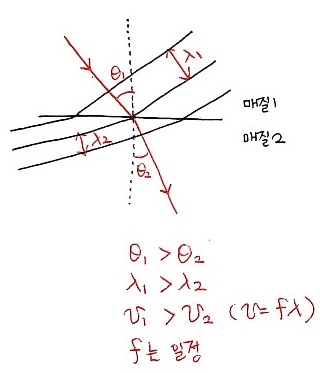 따라서 이 경우엔 파동이 밀한 매질에서 소한 매질로 전파하다 굴절한 상황이다.