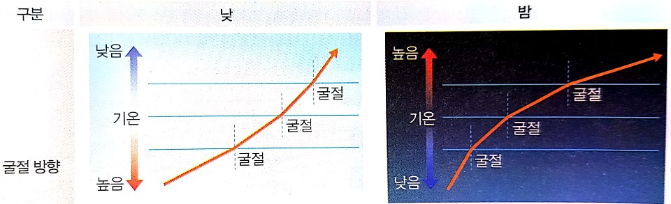 공기 중에서 전달되는 소리의 속력은 기온이 높을수록 빠르다. 따라서 온도가 다른 공기층을 지날 때 소리의 속력 차이가 발생해 소리는 굴절할 수밖에 없다. 온도차에 따른 소리의 진행 방향 변화를 다음 그림으로 확인해보자.