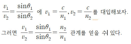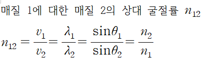 v = c/n (v: 굴절률 n인 매질을 지나는 빛의 속력, c: 진공일 때 빛의 속력)